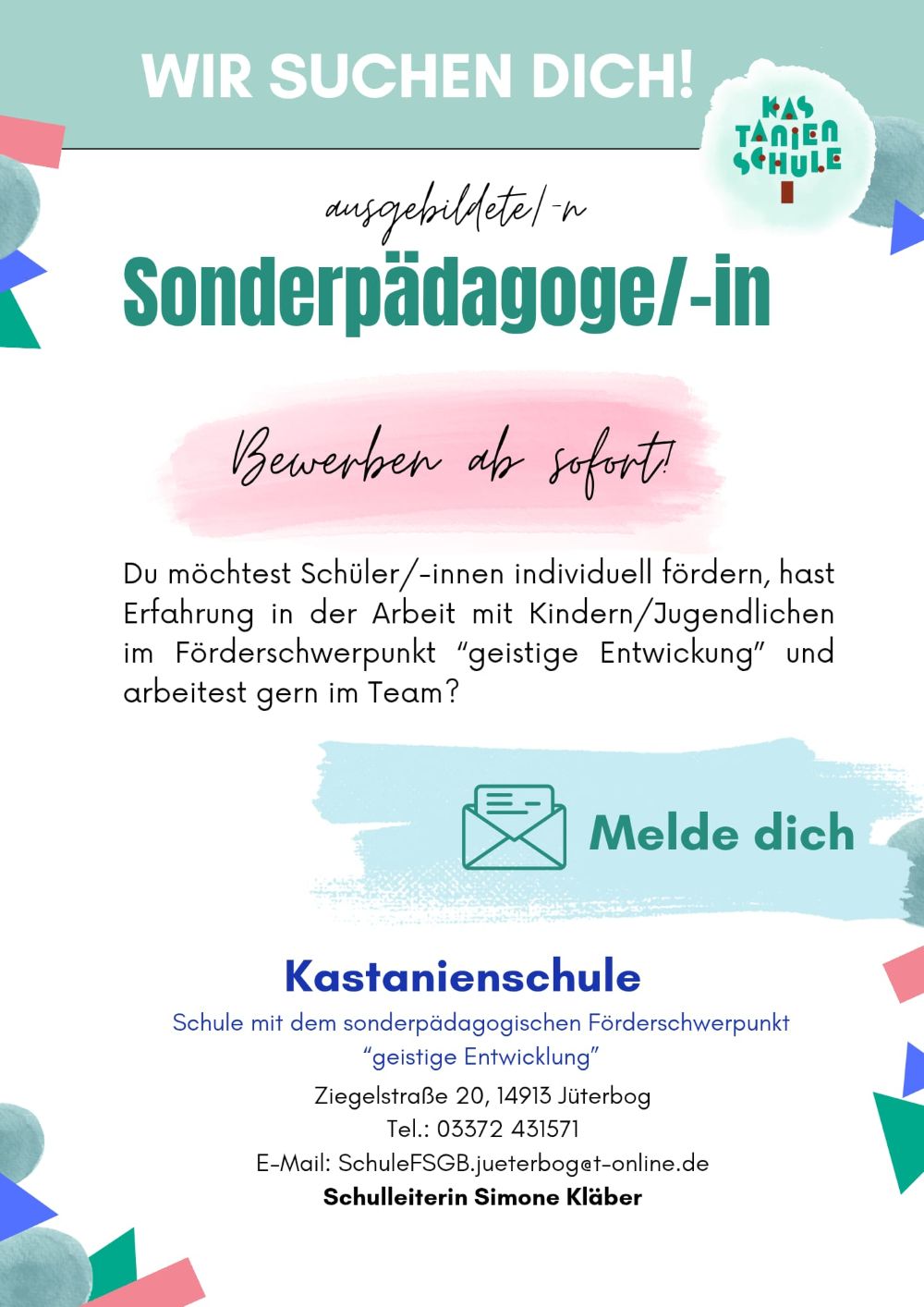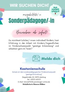 Die Kastanienschule Jüterbog hat freie Stellen für ausgebildete Sonderpädagogen. Über eine Bewerbung qualifizierter Pädagogen würden wir uns freuen.